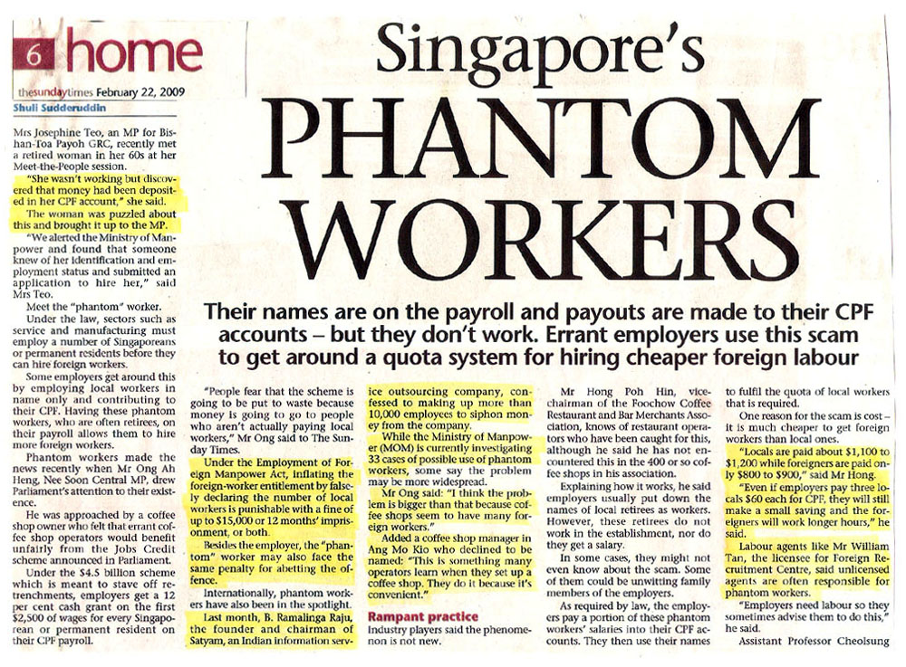 The Sunday Times report on phantom workers (22 Feb 09) showed inherent weakness in the system and with the job credits payouts, such weakness could be further exploited. Fortunately the woman reported the matter to her MP. There may be many others who are not aware or worse do not know that it is an offence to allow their identity to be use by such employers. In my view this increasing problem needs to be addressed before it becomes widespread, undermining the quota system and causing misery to some elderly who may be exploited in return for a small amount of pocket money.