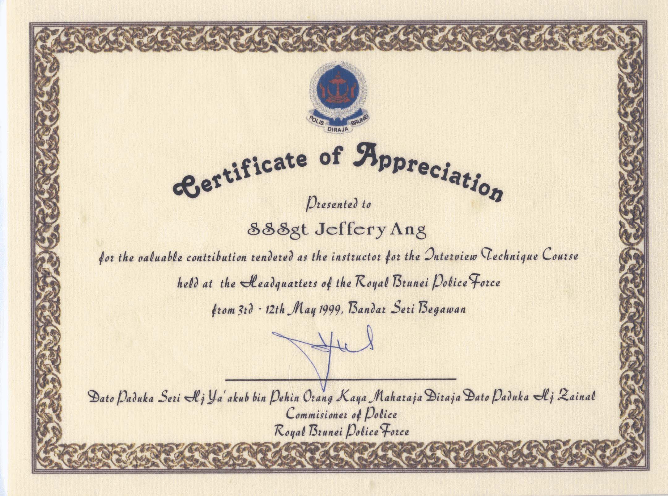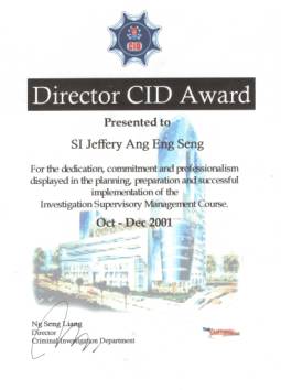In 1999, I developed the interview techniques for the investigation courses conducted by CID for all Investigation Officers. I also helped set up the School of Criminal Investigation in 2001 and remained as the investigation course trainer until my retirement in Sep 2002. During that time I developed the Intermediate and Advance investigation courses and was presented with two Director CID Awards.
