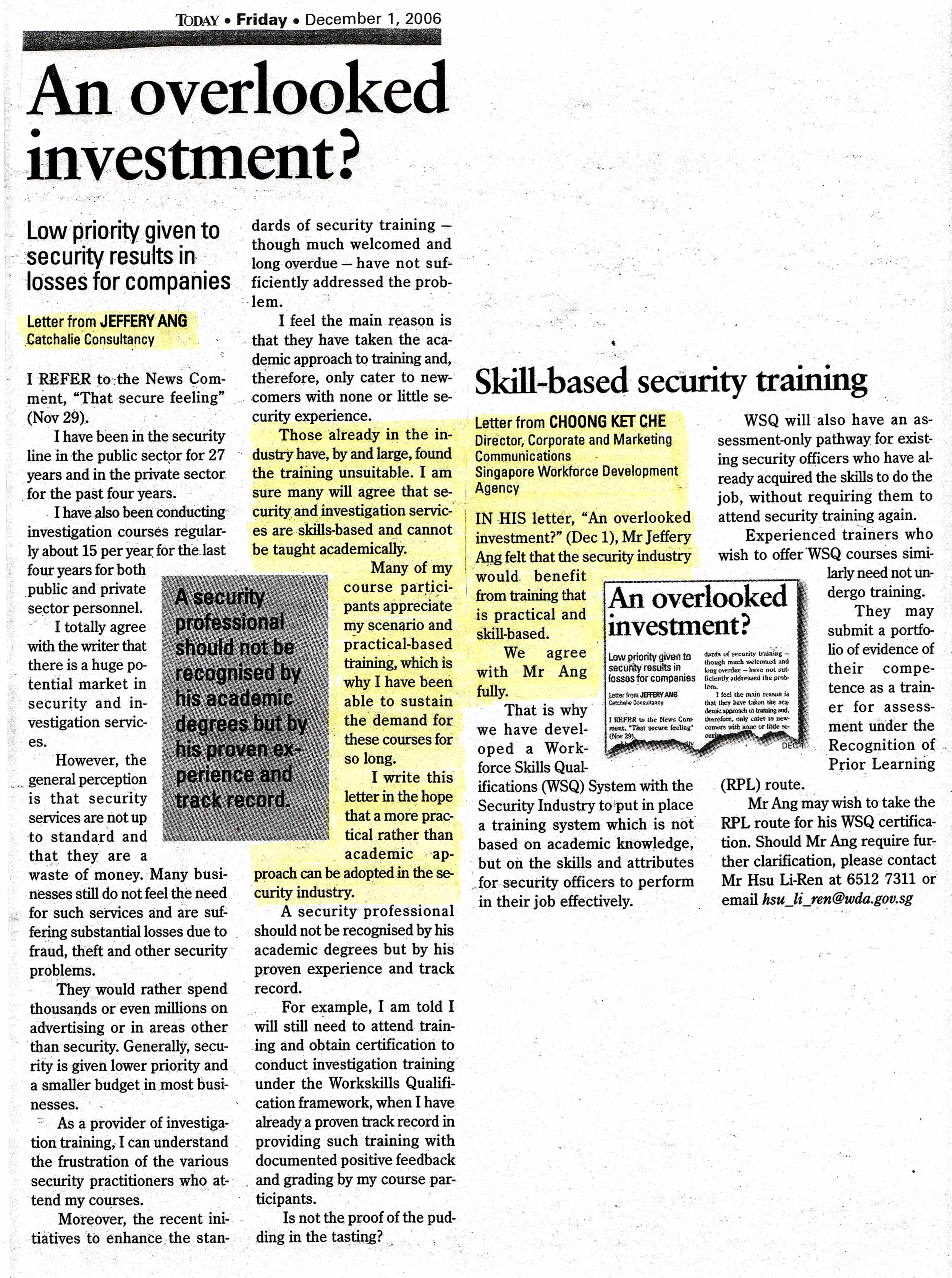 He is engaged by the Civil Service College since Dec 2002 to provide the Investigative interview techniques and Specialist investigation courses for many Government agencies like the Commercial Affairs Dept, MOM, AGC, etc. He had conducted many In-house investigation courses for both public and private agencies like IRAS, SGX, NCSS, NEA, Customs, Council for Private Education Institutes, Mandarin & Orchard Hotel Group and Flextronics Internal Audit & Compliance (Regional) in China, etc.